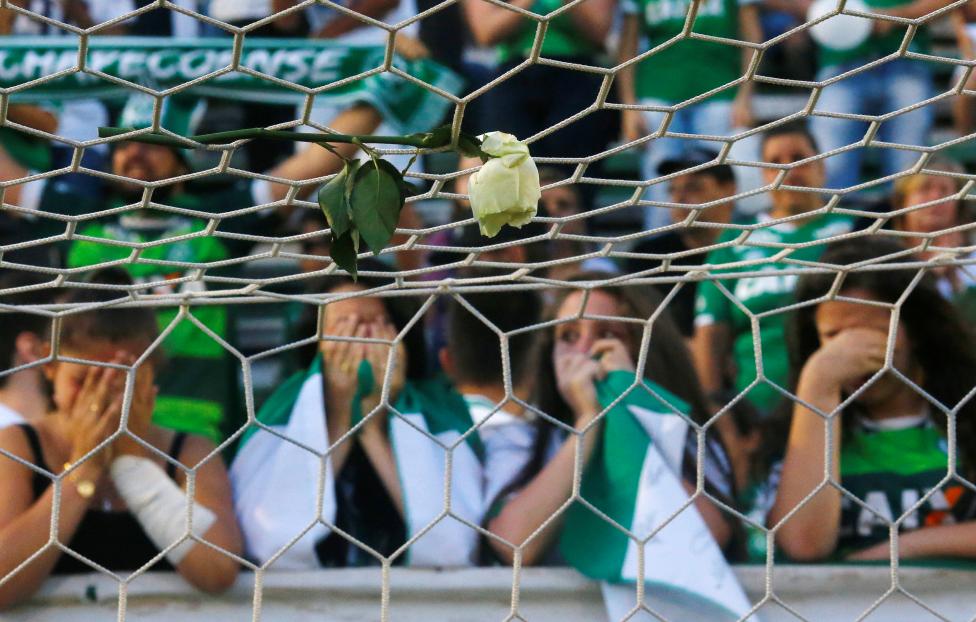 Một bông hoa hồng rũ như nỗi đau thương của những người hâm mộ dành cho các cầu thủ của đội bóng Chapecoense, trong buổi tưởng niệm các nạn nhân tại sân vận động Arena Conda ở Chapeco, Brazil. REUTERS / Ricardo Moraes