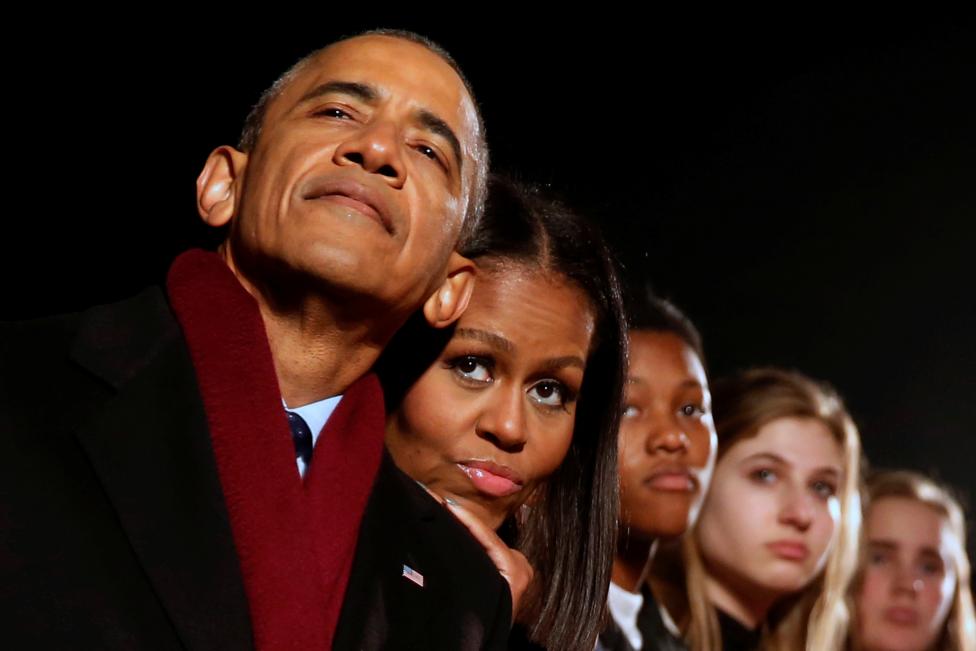 Tổng thống Barack Obama và đệ nhất phu nhân Michelle Obama hạnh phúc khi tham gia lễ thắp sáng cây thông Noel quốc gia ở Washington lần cuối cùng trên cương vị Tổng thống Mỹ. REUTERS / Jonathan Ernst