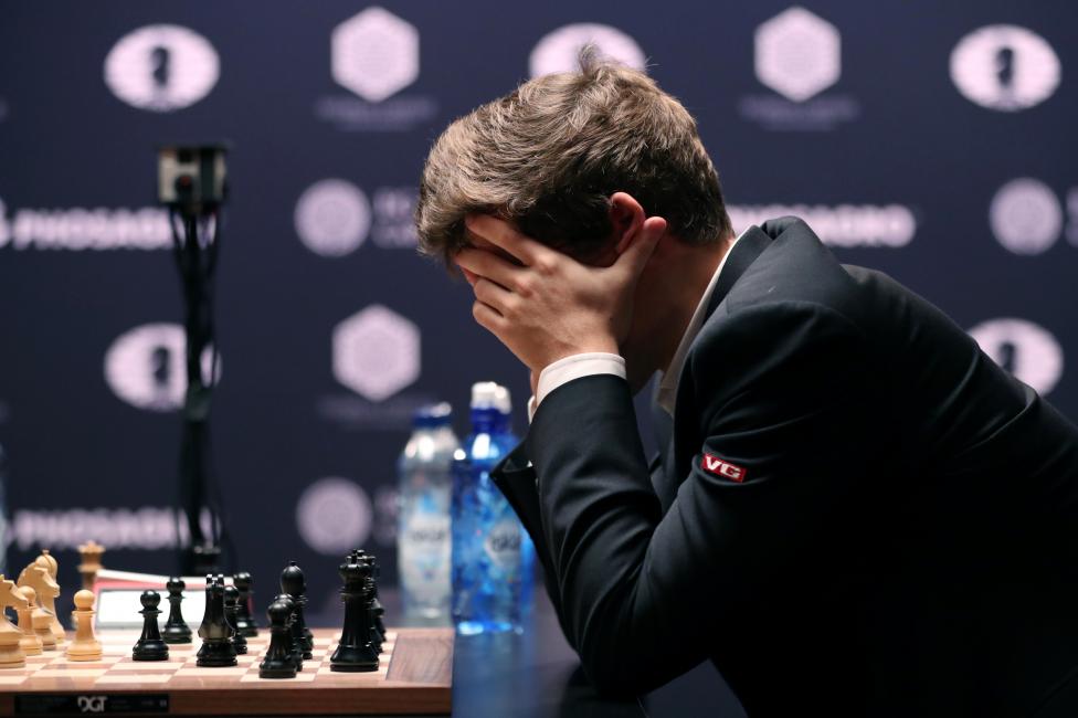 Đương kim vô địch cờ vua thế giới người Na Uy Magnus Carlsen đau đầu trước nước cờ của đối thủ người Nga Sergey Karjakin trong trận đấu đầu tiên giữa họ tại giải Vô địch cờ vua thế giới 2016 ở New York. REUTERS / Mark Kauzlarich