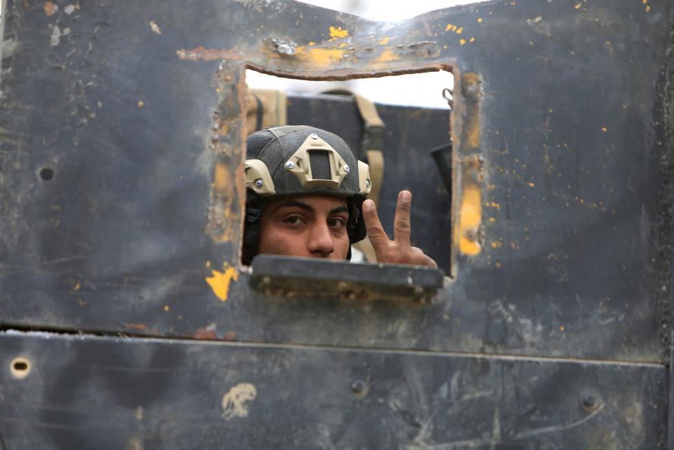 Một thành viên của Lực lượng đặc nhiệm Iraq (ISOF) ra dấu chiến thắng khi ngồi trong xe quân sự tham gia một trận chiến với các chiến binh Nhà nước Hồi giáo IS ở Mosul, Iraq. REUTERS / Alaa Al-Marjani
