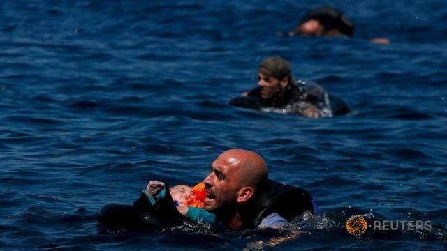 | Hình ảnh người tị nạn Syria ôm con đang cố gắng vào hòn đảo Lesbos của Hy Lạp sau khi vượt qua Biển Aegean. Ảnh: Reuters |