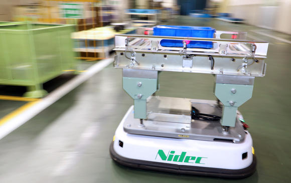 Robot vận chuyển Nidec trượt băng qua sàn nhà máy.