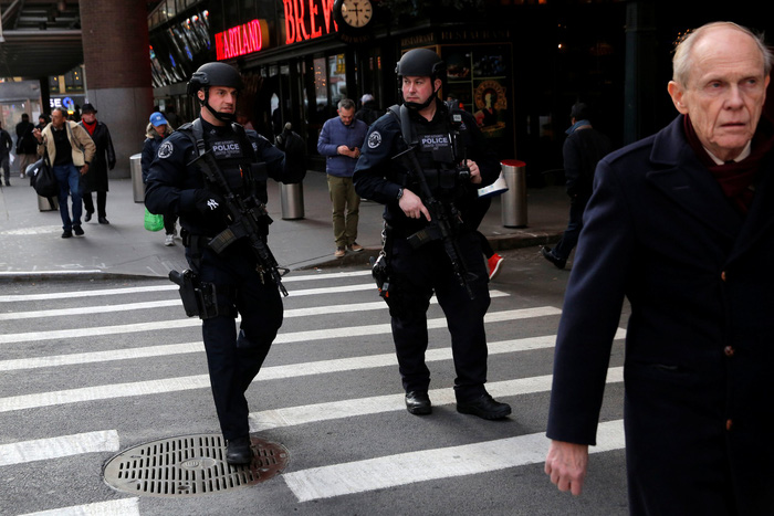 Cảnh sát New York ở bên ngoài khu vực ga tàu điện ngầm bị đánh bom ngày 11-12 - Ảnh: REUTERS