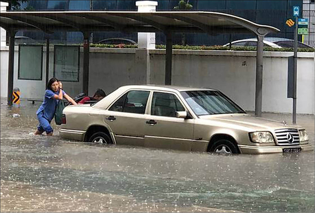 Một phụ nữ đẩy chiếc xe bị ngập trong nước lụt tại khu vực Bedok North, Singapore. Ảnh: Twitter