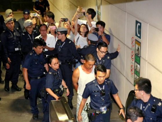| Cảnh sát bắt giữ người đàn ông bỏ lại chiếc túi lạ, làm dấy lên cảnh báo an ninh ở ga tàu điện ngầm Hougang, Singapore ngày 2/4. Ảnh: Today |