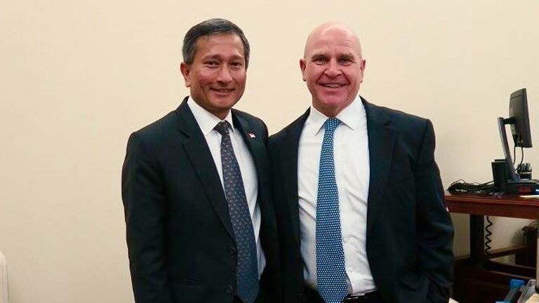 Cố vấn An ninh Quốc gia Mỹ H R McMaster (bên phải) và Bộ trưởng Ngoại giao Singapore Vivian Balakrishnan trong cuộc gặp tại Washington DC. Ảnh: MFA