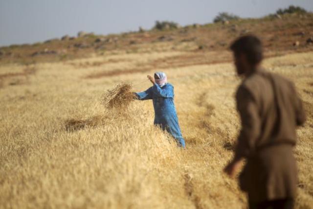 Nông dân Syria trên một cánh đồng lúa mì ở khu vực Maarshamsha, tỉnh Idlib, Syria. Ảnh: Reuters