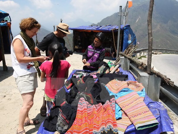 Du khách tham quan mua sắm trên đỉnh đèo Ô Quy Hồ, thị trấn Sapa, tỉnh Lào Cai. (Ảnh: Thanh Vũ/TTXVN)