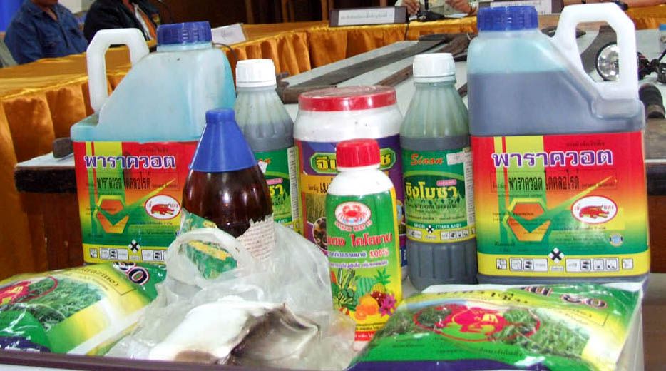 Paraquat và glyphosate là thuốc diệt cỏ được sử dụng rộng rãi ở Thái Lan, và chlorpyrifos thường được sử dụng như một loại thuốc trừ sâu.