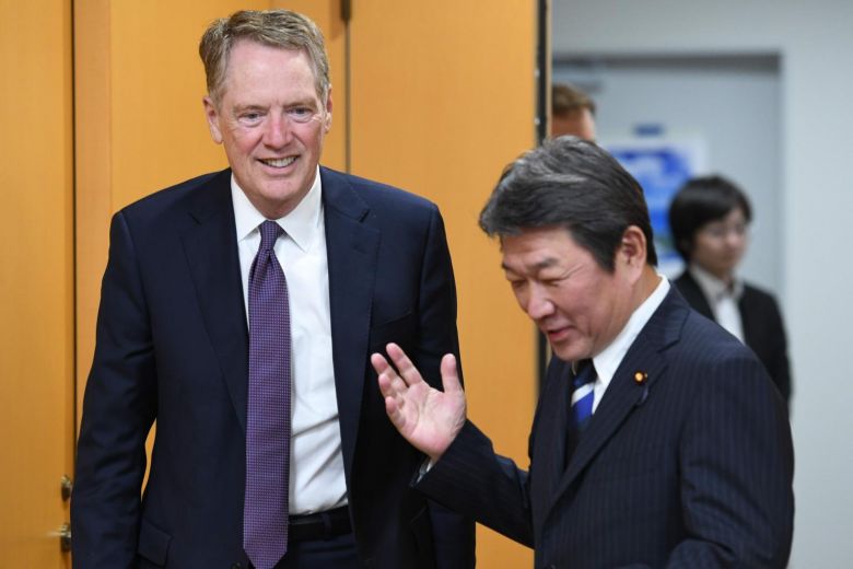 Đại diện Thương mại Hoa Kỳ Robert Lighthizer và Bộ trưởng Tái thiết Kinh tế Nhật Bản Toshimitsu Motegi sau một buổi làm việc tại Văn phòng của ông Motegi