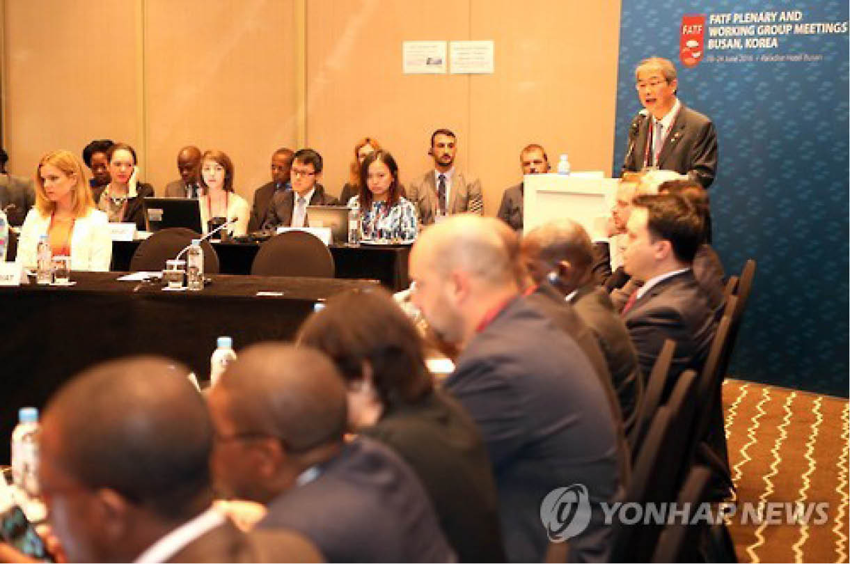 Chủ tịch Ủy ban dịch vụ tài chính Hàn Quốc (FSC) Yim Jong-yon phát biểu trong một cuộc họp toàn thể của FATF và nhóm làm việc tại thành phố Busan, Hàn Quốc. Ảnh: Yonhap