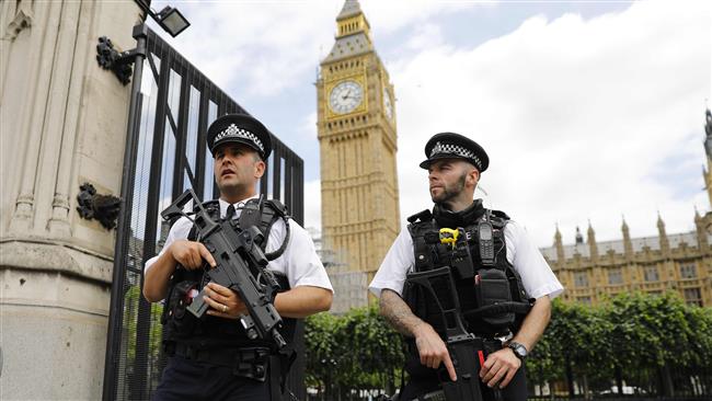 Các nhân viên cảnh sát vũ trang của Vương quốc Anh đứng trên phố London. Ảnh: AP
