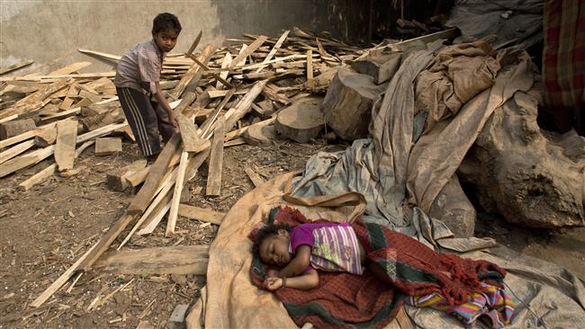 Một bé trai đang làm việc ở cửa hàng bán củi, trong khi cô em gái 1,5 tuổi nằm ngủ trên mặt đất ở thành phố Gauhati, Ấn Độ. Ảnh: AP