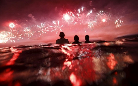 | Người dân Rio de Janeiro vừa tắm biển, vừa ngắm pháo hoa đón chào Năm mới. Ảnh: AP |
