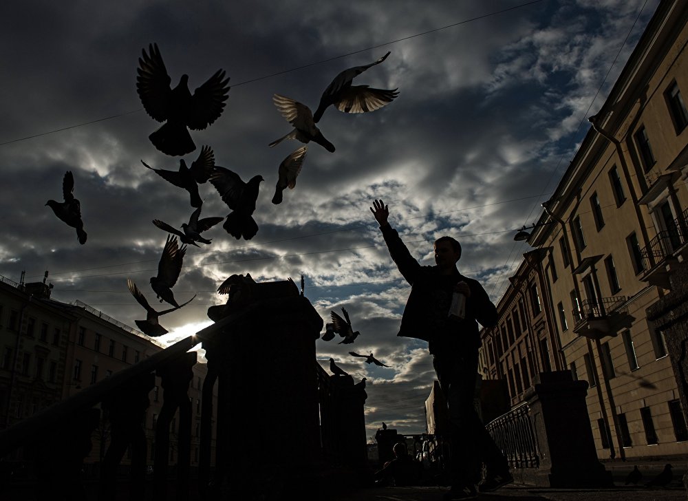| Một người đàn ông đang cho chim bồ câu ăn tại Griboyedov Canal, St. Petersburg, Nga. Ảnh: Sputniknews |
