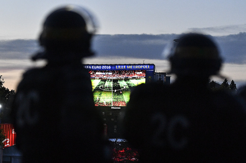 | Nhân viên cảnh sát đang làm nhiệm vụ gần khu vực dành cho người hâm mộ trên một tuyến đường ở Lille, Pháp. Ảnh: Sputniknews |