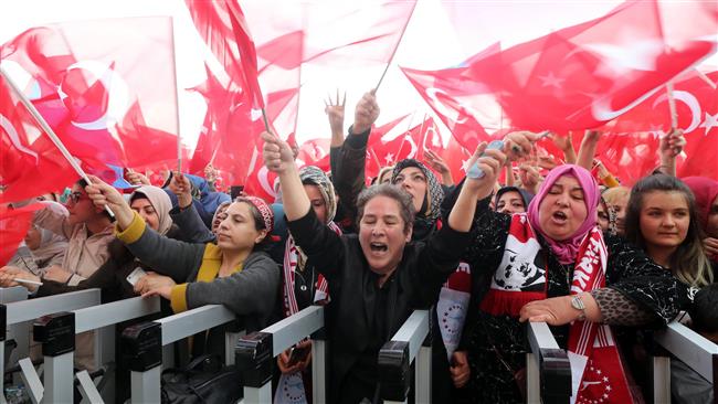 Người dân Thổ Nhĩ Kỳ vẫy cở ủng hộ Tổng thống Erdogan khi ông phát biểu tại Phủ Tổng thống ở Ankara, ngày 17/4/2017. Ảnh: AFP