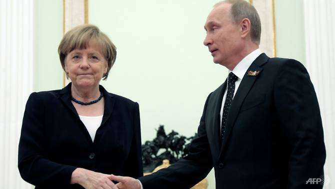 Thủ tướng Đức Angela Merkel (bên trái) và Tổng thống Nga Vladimir Putin trong một cuộc gặp. Ảnh: AFP