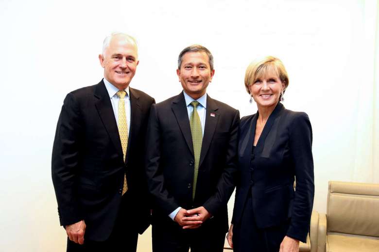 | Thủ tướng Úc Malcolm Turnbull, Bộ trưởng Ngoại giao Singapore Vivian Balakrishnan, và Ngoại trưởng Úc Julie Bishop ở Canberra, ngày 3/3/2016. Ảnh: Straitstimes. |