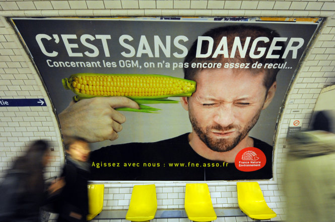 Một quảng cáo chống thực phẩm biến đổi gen thể hiện tại bến tàu điện ngầm ở Paris . Ảnh: AFP