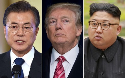 | Tổng thống Hàn Quốc Moon Jae-in (trái), Tổng thống Mỹ Donald Trump và nhà lãnh đạo Triều Tiên Kim Jong-un. Ảnh: Reuters |