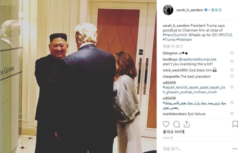 Người phát ngôn Nhà Trắng Sarah Sander cũng đăng tải trên Instagram bức ảnh Nhà lãnh đạo Kim Jong-un tươi cười với Tổng thống Mỹ, kèm theo thông báo “Tổng thống Trump chào tạm biệt Chủ tịch Kim khi kết thúc hội nghị thượng đỉnh ở Hà Nội”.