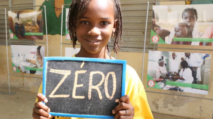 Một đứa trẻ cầm tấm biển ủng hộ chiến dịch “Không còn sốt rét bắt đầu từ tôi” (“Zero malaria starts with me). Ảnh: Devex