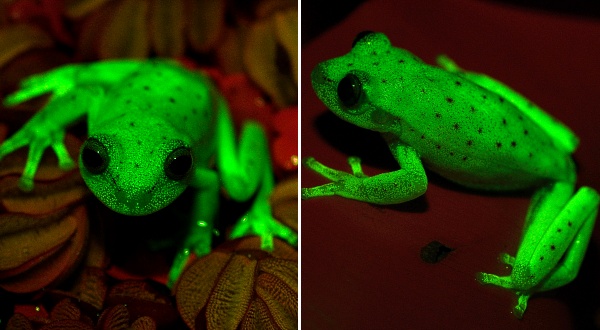 Dưới ánh sáng bình thường, làn da mờ của ếch có màu vàng nâu nhạt với những chấm màu đỏ, nhưng khi các nhà khoa học chiều lên đó một tia cực tím, nó biến màu xanh lá cây.