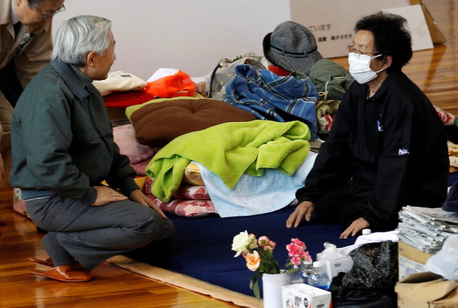 | Nhật hoàng Akihito bình dị đi thăm người dân sơ tán tại Fukushima sau trận động đất - sóng thần xảy ra vào tháng 3/2011 ở Nhật. Ảnh: Reuters |