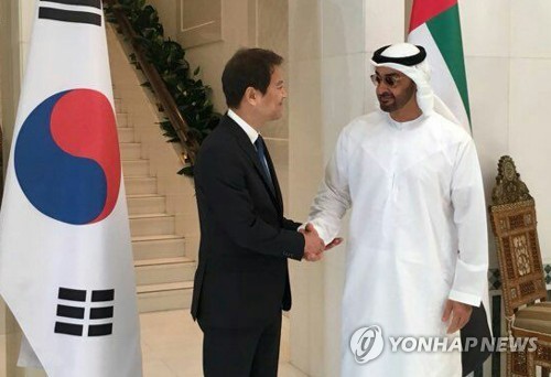 Chánh Văn phòng Phủ Tổng thống Hàn Quốc, ông Im Jong-seok (bên trái) bắt tay với Thái tử Abu Dhabi, ông Mohammed bin Zayed Al Nahyan. Ảnh: Yonhap