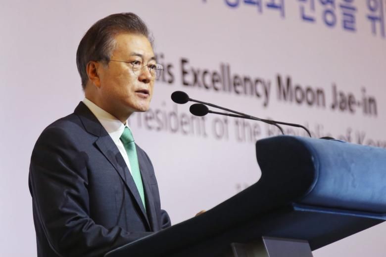 Tổng thống Hàn Quốc Moon Jae-in phát biểu trong khuôn khổ chuyến thăm chính thức tới Singapore ngày 13/7. Ảnh: The Straits Times