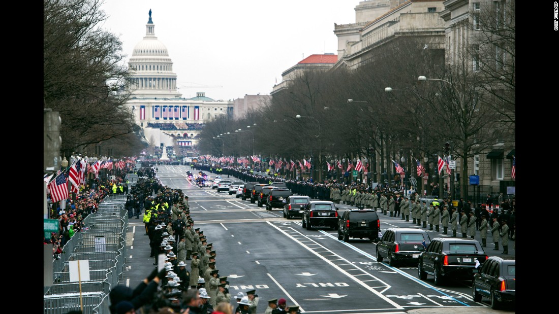 Đoàn xe hộ tống Tổng thống Barack Obama và Tổng thống đắc cử Donald Trump ở Đại lộ Pennsylvania trên đường tới lễ nhậm chức. Ảnh: AP