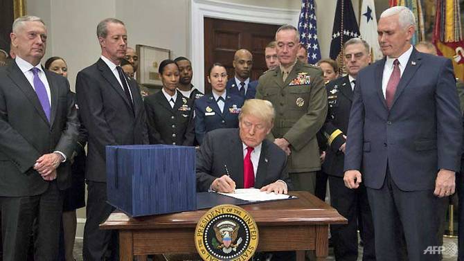 Tổng thống Mỹ Donald Trump ký Đạo luật Cấp phép Quốc phòng (NDAA) cho năm tài chính 2018 tại Nhà Trắng ở Washington D.C., Mỹ. Ảnh: AFP