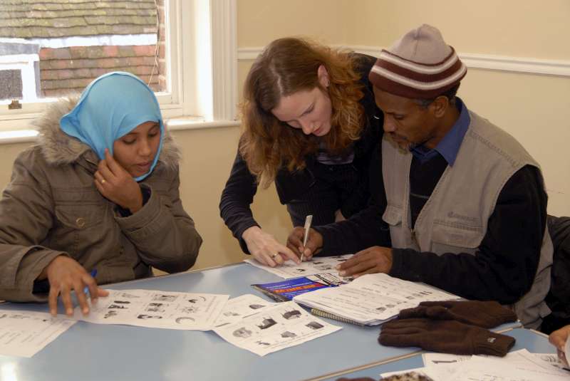 Một nhân viên của UNHCR hướng dẫn thủ tục tái định cư cho người tị nạn. Ảnh: AP