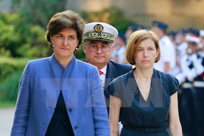 Bộ trưởng Quốc phòng Pháp vừa từ nhiệm nhiệm Sylvie Goulard (trái) và Bộ trưởng Quốc phòng mới được bổ nhiệm Florence Parly (phải) tại lễ chuyển giao quyền lực ở Paris ngày 21/6. Nguồn: AFP/TTXVN