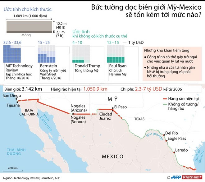 Sau gần 6 tháng lên nắm quyền, ông Donald Trump chỉ mới đề nghị Quốc hội thông qua 1,6 tỷ USD cho dự án ước tính lên đến 20 tỷ USD này. Hiện tại, dọc chiều dài biên giới chung giữa hai nước đã có 965 km tường và rào ngăn./.