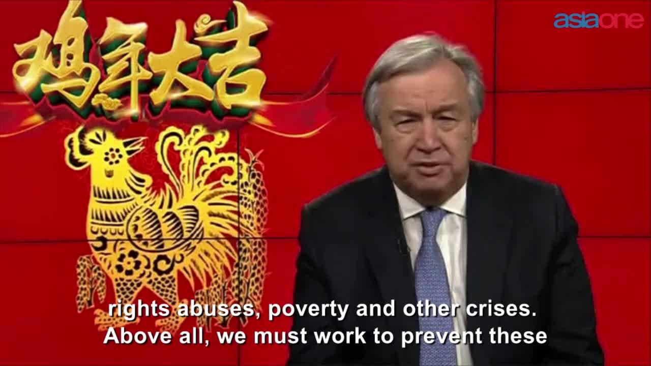 Tổng thư ký LHQ Antonio Guterres trong đoạn tin nhắn video chúc mừng năm mới ĐInh Dậu 2017. Ảnh: Asiaone