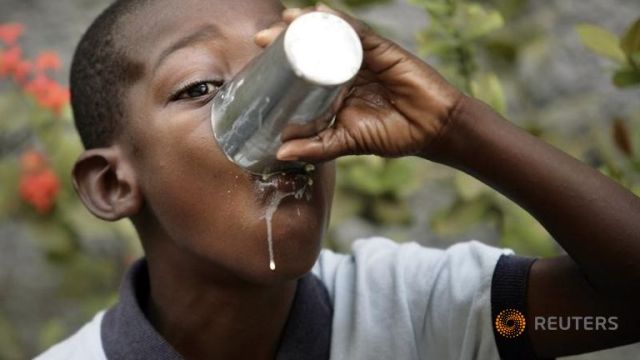 Một bé trai uống sữa trước khi vào lớp học tại khu ổ chuột Cité Soleil, thủ đô Port-au-Prince, Haiti. Ảnh: Reuters