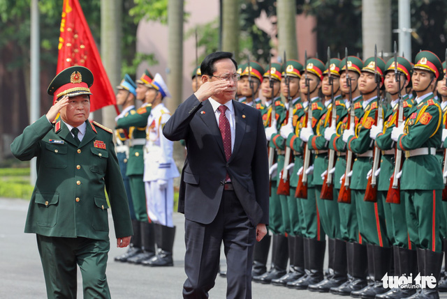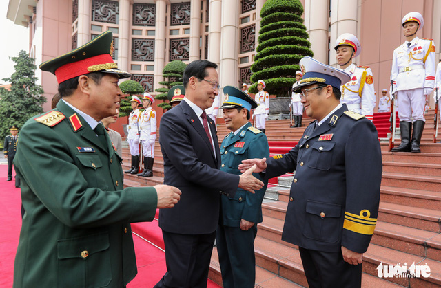 Lãnh đạo quốc phòng Việt - Hàn cùng duyệt đội danh dự tại lễ đón ở trụ sở Bộ Quốc phòng Việt Nam sáng 4-6 - Ảnh: VIỆT DŨNG