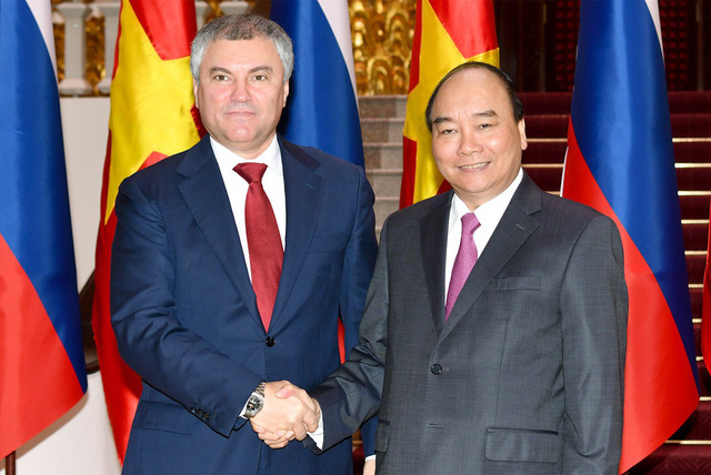 Thủ tướng Nguyễn Xuân Phúc tiếp Chủ tịch Duma quốc gia Nga Vyacheslav Viktorovich Volodin tại Hà Nội ngày 24/12. Ảnh: VGP