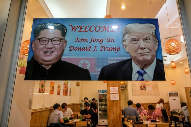 Một nhà hàng ở Từ Liêm, Hà Nội đã treo ảnh hai nhà lãnh đạo Mỹ - Triều ngoài cửa với dòng chữ “Chào đón ông Kim Jong-un và Donald J. Trump”. Ảnh: Getty
