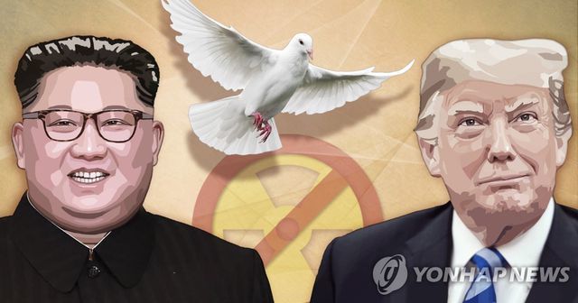 Chân dung lãnh đạo Mỹ - Triều và hình ảnh cánh chim hòa bình trong một bức ảnh của hãng tin Yonhap, Hàn Quốc. Ảnh: Yonhap