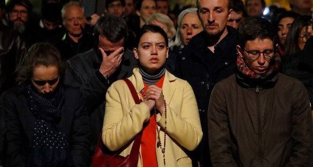 Người dân cầu nguyện khi Nhà thờ Đức Bà ở thủ đô Paris, Pháp chìm trong đám cháy. Ảnh: AP