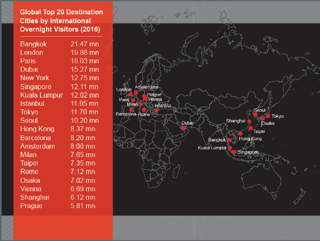 Mặc dù vậy, theo báo cáo của Mastercard Index, thủ đô Bangkok - còn được gọi là "thành phố của các thiên thần", đứng đầu danh sách 132 thành phố năm 2016, đánh bại London, Paris và Dubai để trở thành thành phố thu hút nhiều du khách quốc tế nhất trong các thành phố điểm đến toàn cầu.
