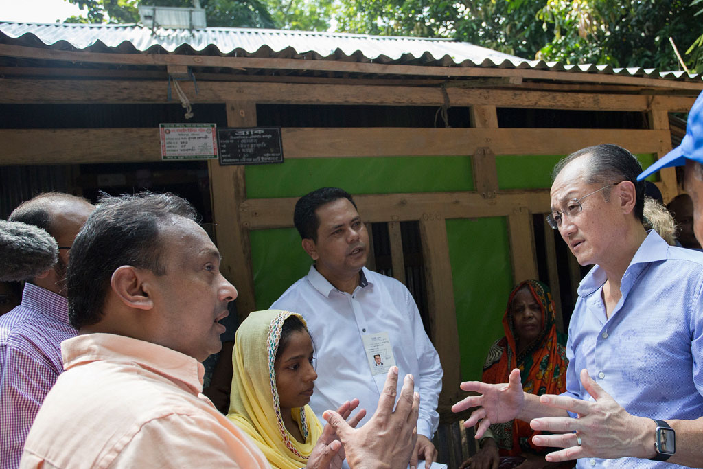 Chủ tịch Nhóm Ngân hàng Thế giới, Jim Yong Kim (phải) trong một chuyến thăm các thành viên của một hệ thống nhà năng lượng mặt trời tại quận Barisal, Bangladesh. Ảnh: WB / Dominic Chavez
