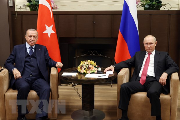 Tổng thống Nga Vladimir Putin (phải) và Tổng thống Thổ Nhĩ Kỳ Recep Tayyip Erdogan (trái) tại cuộc gặp ở Sochi, Nga, ngày 29/9/2021. (Ảnh: AFP/TTXVN)