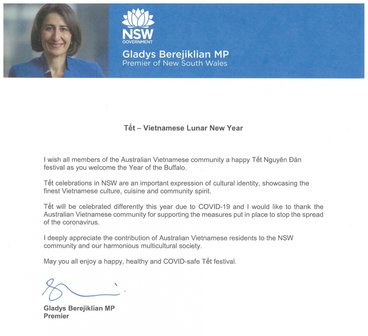 Trước đó, Thủ hiến bang New South Wales Gladys Berejiklian, nơi có đông người Việt sinh sống nhất tại Australia cũng đã gửi lời chúc mừng năm mới tới cộng đồng người Việt đang sinh sống tại đây. Trong bức thư bà Berejiklian khẳng định, Tết của cộng đồng người Việt ở bang New South Wales là một sự kiện sự kiện văn hóa quan trọng, là dịp thể hiện nét đẹp văn hóa của người Việt Nam cùng với các món ăn ngon và tinh thần cộng đồng.