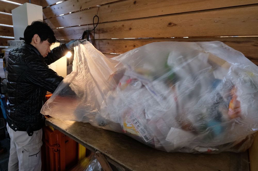 Một túi rác thải nhựa đang được đưa vào một máy ép tại tỉnh Tokushima, Nhật Bản. Ảnh: Bloomberg