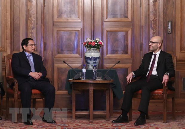 Thủ tướng Phạm Minh Chính làm việc với Tổng Thư ký Tòa trọng tài thường trực Marcin Czepelak. Ảnh: Dương Giang/TTXVN