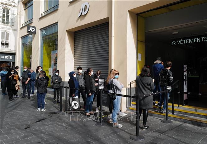Người dân đứng xếp hàng bên ngoài một cửa hàng ở thành phố Nice, Pháp trong bối cảnh dịch bệnh COVID-19 tiếp tục diễn biến phức tạp. Ảnh minh họa: THX/TTXVN